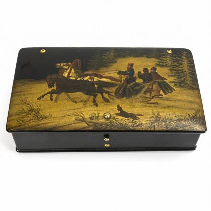 Quaderschatulle mit Knuppenfüßen und Drückerschließe sowie feiner Malerei auf dem Scharnierdeckel. Rasante Fahrt der Troika im goldfarbenen Schnee