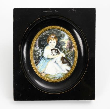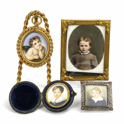 Schwarzes Original-Etui (Prägung "M.son B/Brevete/S.G.D.G.") mit herausnehmbarem Knabenbildnis (Gouache) in verglaster Messingleiste. / Gouache-Knabenbildnis im "800" gepunzten Silberrahmen mit Korallenperlchen und Verglasung. / Ovales Kinderbildnis (übermalter Fotoumdruck auf Rechteck-Porzellanplatte) im verglasten Messingrahmen mit Prägungen. / Engel nach Raffael (Gouache) im verglasten Messingrahmen mit Ständer