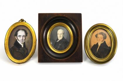 Sehr fein gemaltes Bildnis eines Herren mit hoher Stirn im verglasten Messingrahmen. / Junger Mann im verglasten Messingrahmen. / Älterer Mann im Talar mit Tatzenkreuz-Orden; verso "W. Bogert 1828" bezeichnet