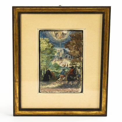 Darstellung einer Hirschjagd im bewaldeten Gebirge mit Erscheinung Christi im Himmel sowie im Bild integrierte goldfarbene lateinische Bibelzitate