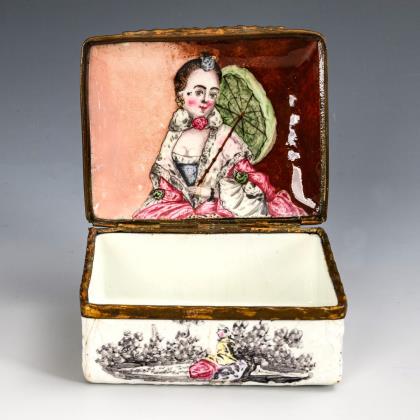 Quaderkorpus mit bombiertem Scharnierdeckel und verzierter Montierung. Allseits, auch auf dem Boden Grisaille-Landschaften, teils mit farbig gestalteten Personen. Auf dem Deckel ein galantes Paar; im Deckel Porträt einer jungen Dame mit Sonnenschirm