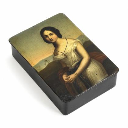 Biedermeier-Lackdose mit Mädchenbildnis "Atala". Stobwasser.