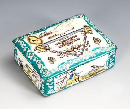 Quaderdose mit aufgelegtem, bombiertem Deckel. Auf dem Deckel beschriftete Schlachtordnung, im Deckel Bataillemalerei mit Kavallerie, Infanterie, Zeltlager und Kanonen. Auf allen Seiten Biwakszenen mit Zelten, Kanonen und Soldaten, auf dem Boden ein weißer Blütenzweig. Dosenkorpus innen weiß