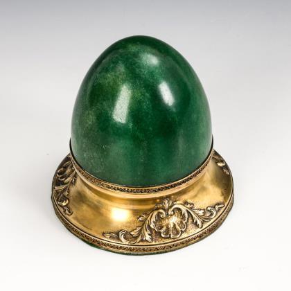 Sockel mit Reliefornament, Scharnierdeckel mit hohl geschnittenem ovoiden Stein. Innen vergoldeter Silbernapf
