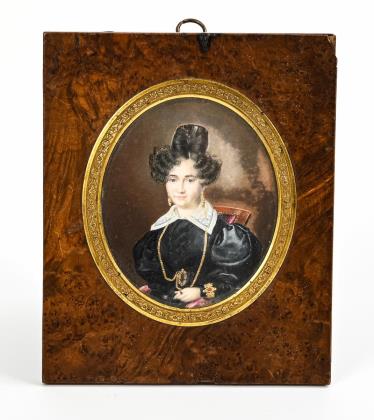 Biedermeier-Miniatur: Junge Frau mit Goldschmuck.