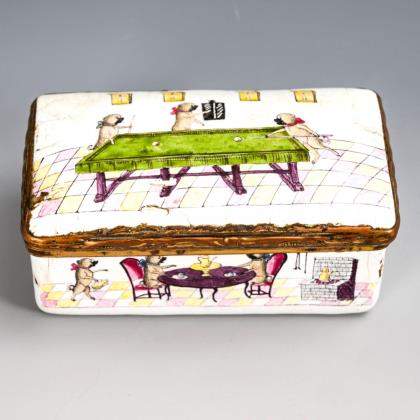 Quaderkorpus mit bombiertem Scharnierdeckel sowie reliefierte Montierung. Allseits, auf dem Boden sowie auf und im Deckel Szenen mit Möpsen beim Spiel (Billard, Backgammon) sowie häuslichen Szenen bzw. Arbeiten