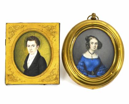 Empire-Bildnis eines jungen Mannes im verglasten Rahmen mit fein gewalzter Messingblechfront. / Biedermeier-Bildnis einer jungen Frau mit leuchtend blauem Kleid im verglasten Messingblech-Profilrahmen