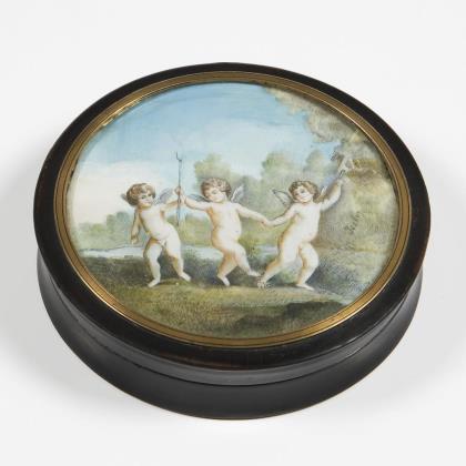 Lack-Tabatiere mit Miniatur: Tanz der Amoretten.