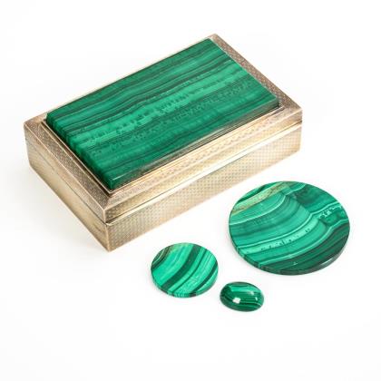 Allseits fein guillochierte Quaderschatulle aus Silber mit erhabener Malachitscheibe am Scharnierdeckel sowie Holz-Boden; innen grüner Stoff mit Sichtfenster zum Stein. / 2 runde Malachitscheiben und ein Malachit-Cabochon