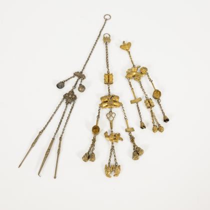 Wohl China. Vielteilige Metallgehänge mit verschiedenen, symbolischen Hohlformen. Eines mit Lanzette, Pinzette und sehr kleinem Löffelchen als Anhänger