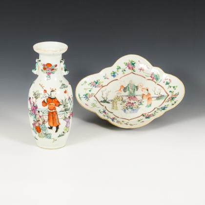 Balustervase mit kleinen Handhaben. Spielende Kinder als Motiv. H 24 cm. Aufkleber: "Ching Dynastie 1736 - (1796)". / Mehrpassige, flache Schale mit etwas beriebener, figürlicher Bemalung. Rhombenförmiger Fußsockel mit Wellenornament. Unterseite mit Fledermaus- und Pfirsich-Bemalung. Ausfuhrsiegel. 5 x 28 x 22 cm