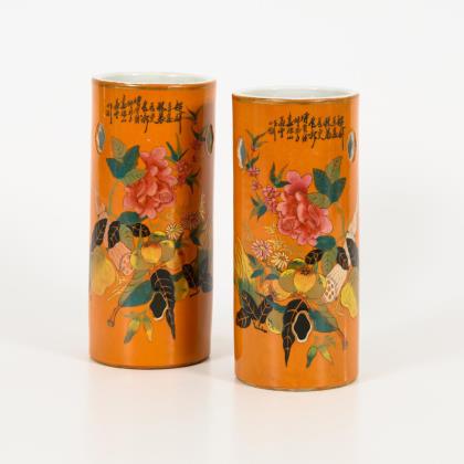 Paar Porzellan-Zylindergefäße mit oranger Wandungen.