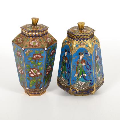 2 kleine Cloisonnévasen mit Deckel.