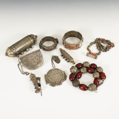 Silberteile: Halbrunde Gürteltasche H 6,5 cm / Runder Anhänger mit Kügelchen Ø ca. 7 cm. / Armreif mit Korallen B 3,5 cm. / Armreif mit feiner Reliefstruktur, B 2,5 cm. / Kette mit Korallen und kleinem Amulettbehälter, L ca. 50 cm. / Unedle Teile: Großer und kleiner Amulettbehälter L 14 und 9 cm / Snuffbottle H 8 cm / Kette mit hohlen Metallkugeln und dunkelroten Perlen aus Naturmaterial. L 51 cm