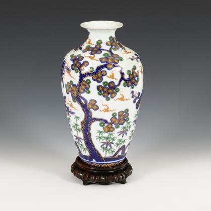 Balustervase mit drei stilisierten Blütenbäumen (Kirsche, Kiefer und ?), unten durch Bambuspflanzen ergänzt. Unterglasur-Blaumalerei, mit Gold, Grün und Rot ergänzt