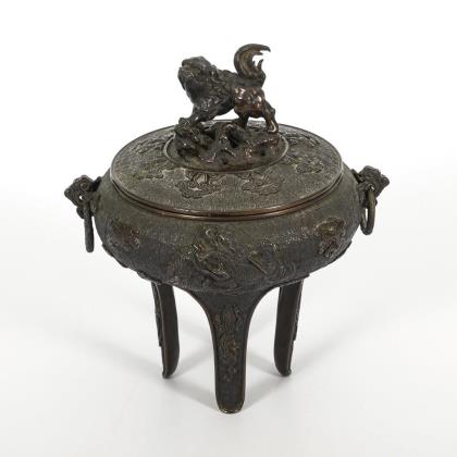 Qualitätvolle Arbeit eines Dreibeins mit feiner Reliefornamentik. Bewegliche Ring-Handhaben und lebendig wirkendes Fabelwesen als Knauf. Dort Lüftungslöcher im Deckel
