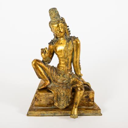 Auf dreireihigem Lotussockel sitzende Figur im Verschränkungssitz. Sorgfältig ausgeführter Guss mit detailreicher Oberfläche. Reste schwarz-brauner Patinierung und Lackvergoldung. Boden offen, innen rote Farbflecken