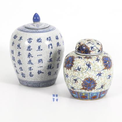 Kleinere Vase, gemarkt wohl Kangxi, mit sehr feinen Rankenmustern in Emailfarben und Unterglasurblau. Deckel mit alter Reparaturstelle eines Brandrisses. / Vase mit feinem Krakelee, Schriftzeichen und Musterung in Unterglasurblau