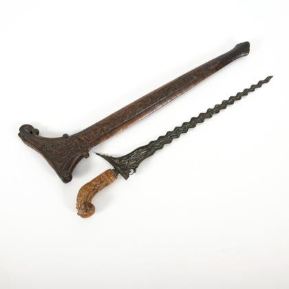 Gerade Klinge mit Pamor, glatte Holzscheide mit heller Wrangka (hier Fehlstellen) und beschnitztem Griff. Gesamt L 55 cm. / Leichte, gewellte Klinge mit Pamor. Dunkle Holzscheide mit beschnitzter Wrangka und Griff. L 55,5 cm