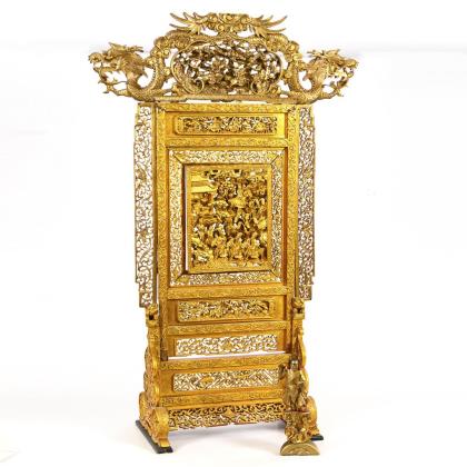 Fünfteilige goldfarbene Schnitzarbeit mit durchbrochen gearbeiteten Motiven. Kampfszene Landschaft mit Figuren, Ornamente, Drachen, Fo-Hunde und anderes. Rückseite rot gefasst