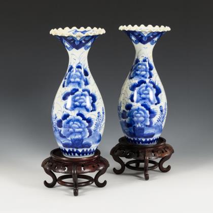 Schlanke Vasen mit großen Päonienblüten in Unterglasur-Blaumalerei. Innenansicht der offenen Mündung mit Bambusdekor. Holzsockel wohl jünger ergänzt. Boden dick glasiert