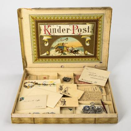 Mit Inhalt unterschiedlichen Alters, darunter handgeschriebene Briefe, Briefmarken, Postkarten, Formulare und Miniatur-Schreibzeug