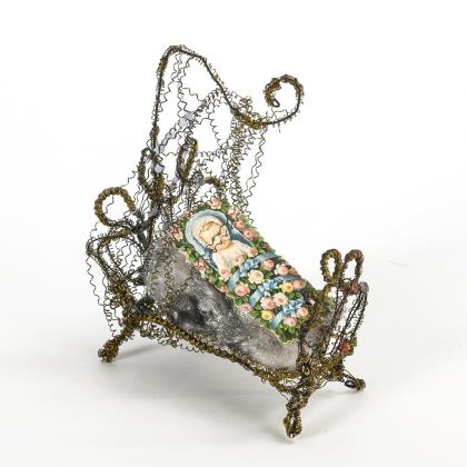 Kleines Bett als Christbaumschmuck, mit Oblaten-Baby