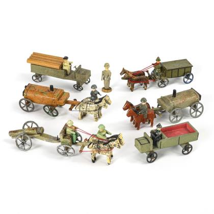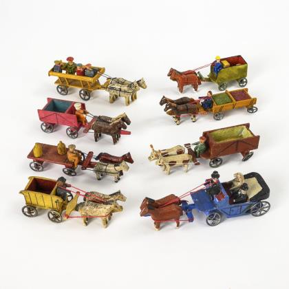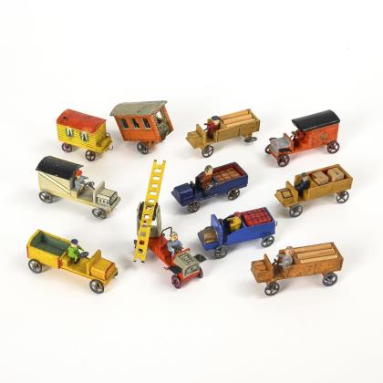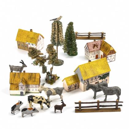 Verschiedene Häuser, Fahrzeuge, Figuren, Bäume und Zäune, in Art eines Musterkartons zusammengestellt. H 2,5 - 7,5 cm