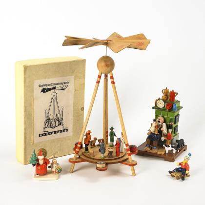 Stabpyramide, Räuchermann und 2 Wendt & Kühn-Figuren. Erzgebirge.