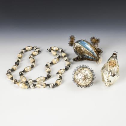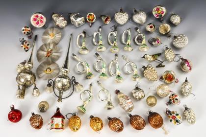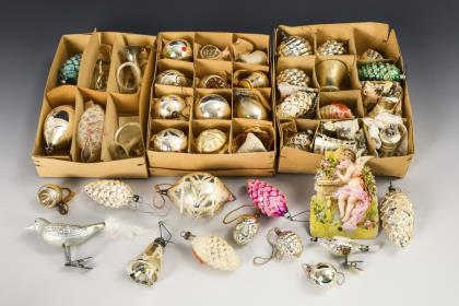 Ca. 50 Teile. Zahlreiche Kugeln, Zapfen und Nüsse, 11 Trompeten und 2 Christbaum-Spitzen mit leonischen Drähten