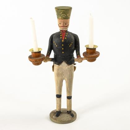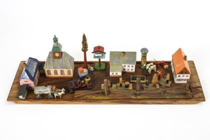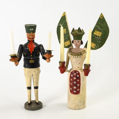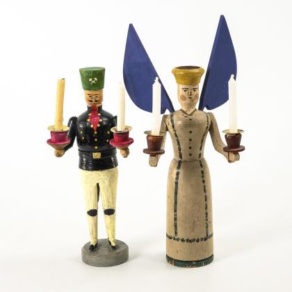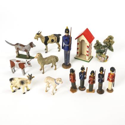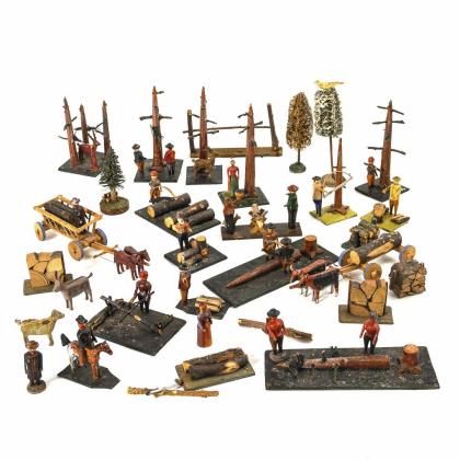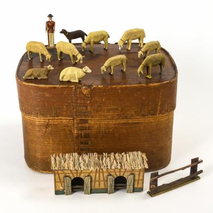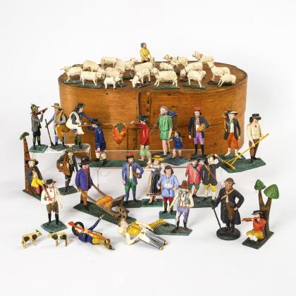 Ca. 20 handgeschnitzte und modellierte Figuren, darunter Gabenbringer, Jäger, Bauern etc. sowie 18 Schafe. In ovaler Spanschachtel (16,5 x 42,5 x 27,5 cm)