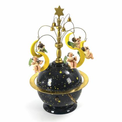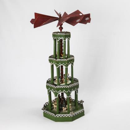 Weihnachtspyramide aus Holz in grün, silber und bordeaux mit 11 abnehmbaren Flügeln aus dunkelrot bemaltem Holz, Verzierung aus geprägter Pappe in silber, drei Stockwerke mit Figuren: Unten 6 Schafe in einem verschneiten Wald, in der Mitte der Heilige Petrus als Dirigent, gefolgt von fünf musizierenden Engeln; oben 5 Rehe