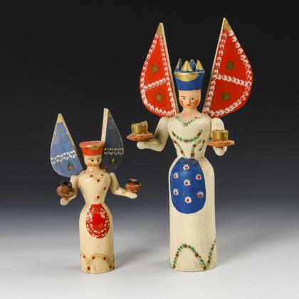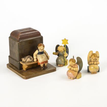 Reich bemalte Engel in Rot, Blau und Grün. Die beiden großen Engel mit Lichtnapf (H 17 cm), die 3 kleineren musizierend (H 12,5 cm)