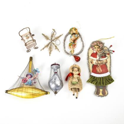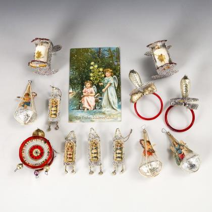Verschiedene, seltene Pappanhänger mit Glimmer, darunter 2 Wiegen, 4 Schlitten, 2 Schnuller und 3 Schaukeln mit leonischen Drähten. Dazu alte Weihnachtskarte