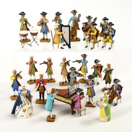 24 Figuren: Friedrich August der Starke und Reichsgräfin Cosel, dazu 22 "Barocke Musiker". Walter Werner Kunsthandwerk, Seiffen.