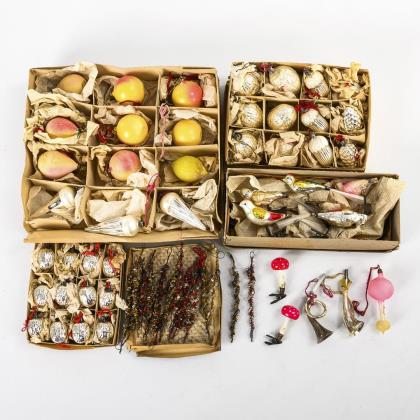 Ca. 40 Teile. Verschiedene, teils farbige Kugeln, Zapfen, Glocken und Trompeten. Einige mit Schneegrieß. In 3 Kistchen