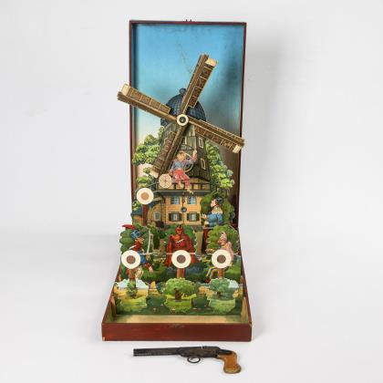 Schiess-Spiel mit festem, aufstellbaren Kasten, großer Papp-Windmühle und mehreren Zielen. Dazu Pistole "Ideal" und Kopie der originalen Anleitung in deutscher Sprache "Schiesshalle. Eine Unterhaltung für Jung und Alt"