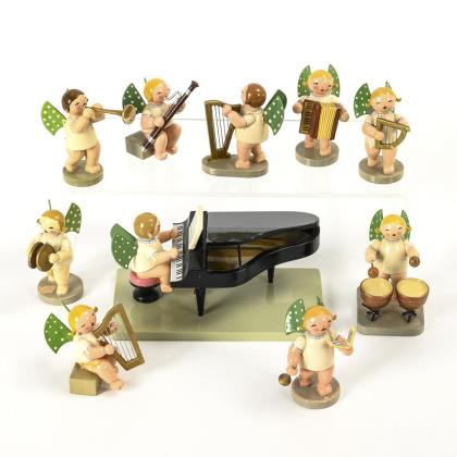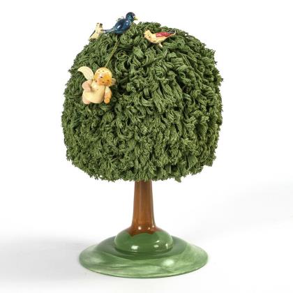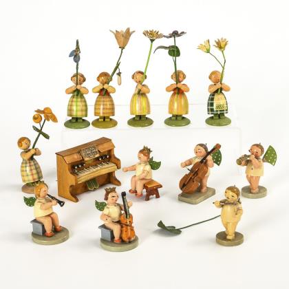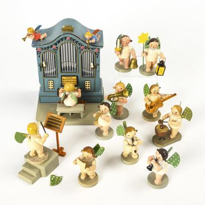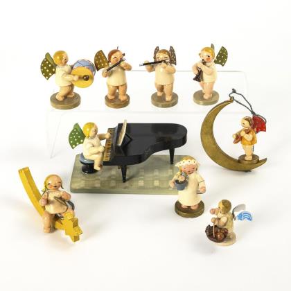 Spieldose in Form eines Apfels mit Kinderkonzert, in der Mitte eine Szene aus vier musizierenden Kindern und einem Gartenzaun mit zwei Vögeln. Werk läuft langsam, spielt: "So ein Tag, so wunderschön wie heute". H 14,5 cm. / Dazu 8 detailreich gestaltete Bergmänner (H 8.5 - 9 cm) nach Art einer Bergparade. Mit Attributen wie Äxte, Fackeln, Feuerschalen mit farbiger Wolle als Feuer und Erzpartikel. Je am Fuß der Figur Aufkleber mit Berufsbezeichnung: Bergmeister (Nr. 9) Schichtmeister mit Bergfahne (Nr. 10, H mit Fahne 13.5cm) Knappschaftsältester (Nr. 11) Häuer (Nr. 12) Bergzimmerer (Nr. 13) Bergmaurer (Nr. 14) Bergschmied (Nr. 15) Fackelträger (Nr. 16)