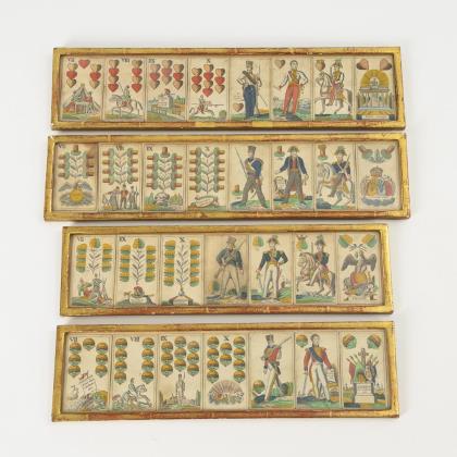 Zum 30-jährigen Jubiläum der siegreichen Beendigung der Kriege gegen Napoleon herausgebrachte Spielkarten mit Militärdarstellungen: Offiziere, Soldaten, Szenen und Symbole unter teilweiser Nennung der Schlachten z.B. Wartenburg, Großbeeren, Paris, Waterloo, (Völkerschlacht) Leipzig usw. In 4 schmalen verglasten Rahmen