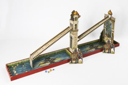 Seltenes Kugelspiel. Aufstellbare Spielkulisse in Form eines indischen Palastes und zweier Elefanten. Dazu 2 kleine originale Spielfiguren aus Celluloid und einige Glasmurmeln