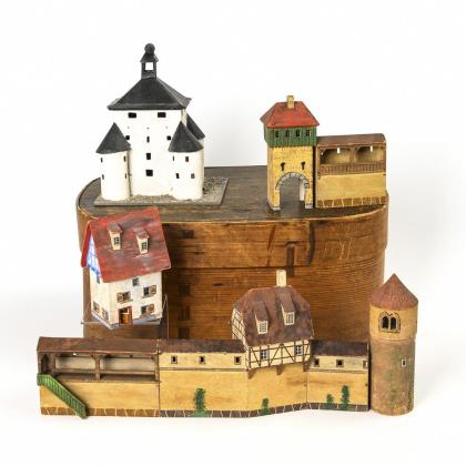 Setzkasten in Form eines Schau-Hauses mit offenem Giebel und 10 Stübchen. Eingerichtet mit verschiedenen Figurenszenen. 20 x 28 x 4 cm. Dazu ca. 26 kleine Einzelfiguren. H je 3,5 cm