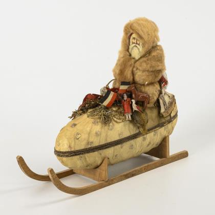 Watte-Weihnachtsmann mit Oblatengesicht, auf spitzovaler Candybox mit Holzkufen sitzend. Mit Schriftzug "Fröhliche Weihnachten" aus Goldpappe