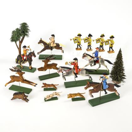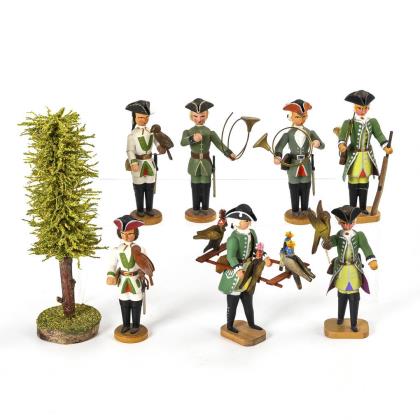 17 Teile: 5 kursächsische Jagdreiter, 4 sächsische Hofbläser, 6 Tiere und 2 Bäume