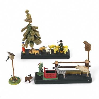 2 schmale Sockel: 1x Schäfer, Schafe und großer Tannenbaum. 1x Brunnen, Tiere und kleiner Luffa-Baum. Jeweils auf grünem Holzsockel, 20 x 5,5 cm. / Vogelhaus auf rundem Sockel, H 12 cm
