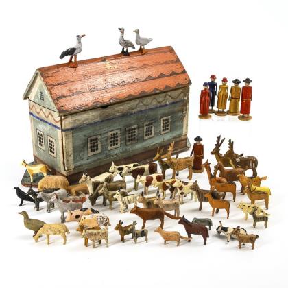 Neuzeitliche Arche aus dem Erzgebirge, 15 x 24,5 x 9 cm. Darin alte kleine Reifentiere aus den 1930er Jahren, H 1,5 - 2 cm
