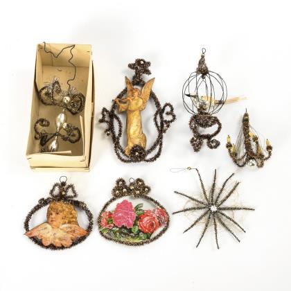 7 Teile Christbaumschmuck mit Oblaten und leonischen Drähten.