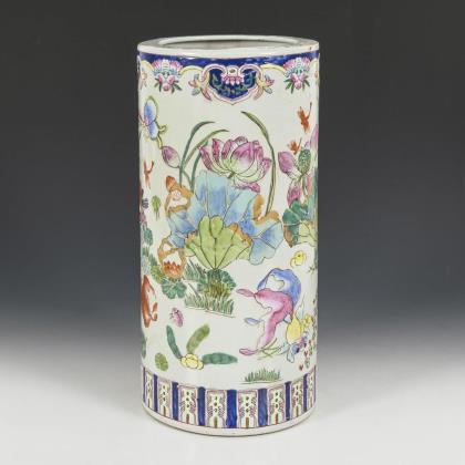 Zylindrische Form mit kleinem, geradem Innenrand. Wasserpflanzen, Fische und Enten in polychromer Emailbemalung