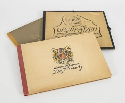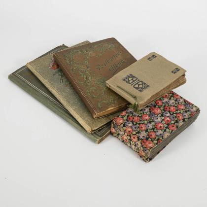 2 Alben mit ca. 240 Kitsch- und Glückwunschkarten. Graue Alben mit Mohn bzw. Reitern auf dem Deckel / 3 Alben zusammen ca. 247 Ansichtskarten mit verschiedenen Themen: Ca. 96 Alpen- und Gletscheransichten. Braunes Album mit Prägedruck auf dem Deckel. / Ca. 100 Liederkarten mit Text und Bild (Seemanns-, Wander-, Liebes-, Städte-, Heimatlieder usw.). Kleines Album mit Rosen-Stoffbezug. / Ca. 51 Karten bzw. Fotos von Musikkapellen, Solisten. Kleines Album mit Jugendstil-Ornament