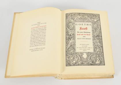 Prachtausgabe, mit einer Einleitung "Faust und die Kunst" von Max von Boehn. Hundertjahrsausgabe. 221 und 449 Seiten auf Büttenpapier, im Halbpergamenteinband