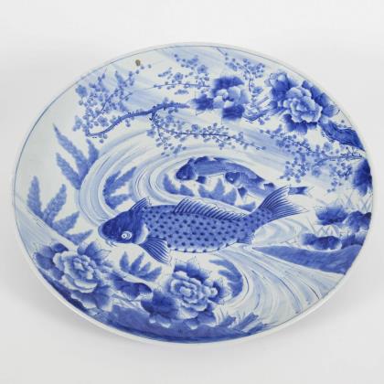 Sehr großer Teller mit Fisch- und Blumenmotiven.